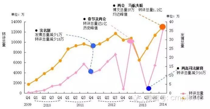 2011年底,实名制因相关规定出台被提上议事日程,对言论表达的质量和真实度提高了门槛,微博作为新的社区江湖,各方达人展开言论博弈。从图1中看出,2013年第四季度,转评总量下降30万次,由于8月“秦火火”等网络水军团伙被警方摧毁,“网络净化活动”强势展开,以及9月9日“两高”司法解释的新闻发布会召开,再一次给狂欢的微博舆论注入了镇定剂。但在每年“两会”、春节,以及重大突发和大型事故中,意见领袖都可能原地复活再显影响力。