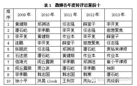 微博影响社会,意见领袖影响微博。每年具有广泛影响力的人物,是其关注社会焦点的热情不减,发布不辍,互动不歇的勤奋,让其成为焦点。每年最具影响力的人物,或许早已刻在微博发展历程中(表1)。