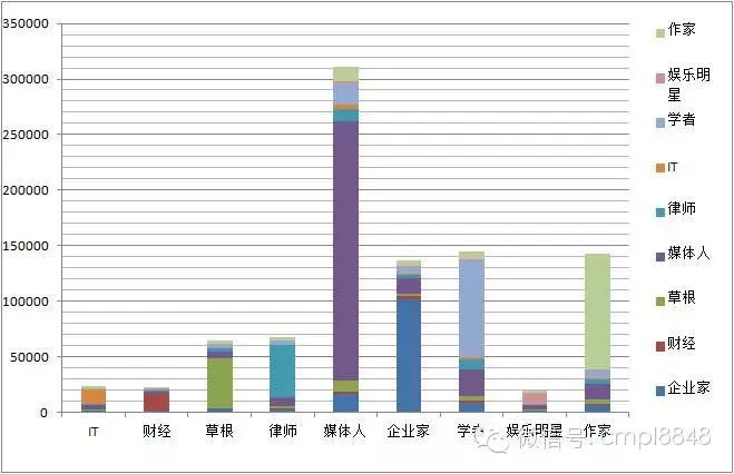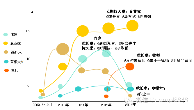 以人格魅力、社会地位、社交圈际广泛、思维活跃和呼朋唤友的联动力,企业家多为长期持久群体。屡次进入转评总量前十的@李开复、@潘石屹、@任志强;微博图书营销和互动频繁让作家@郑渊洁成为微博舆论的文化标杆性人物。